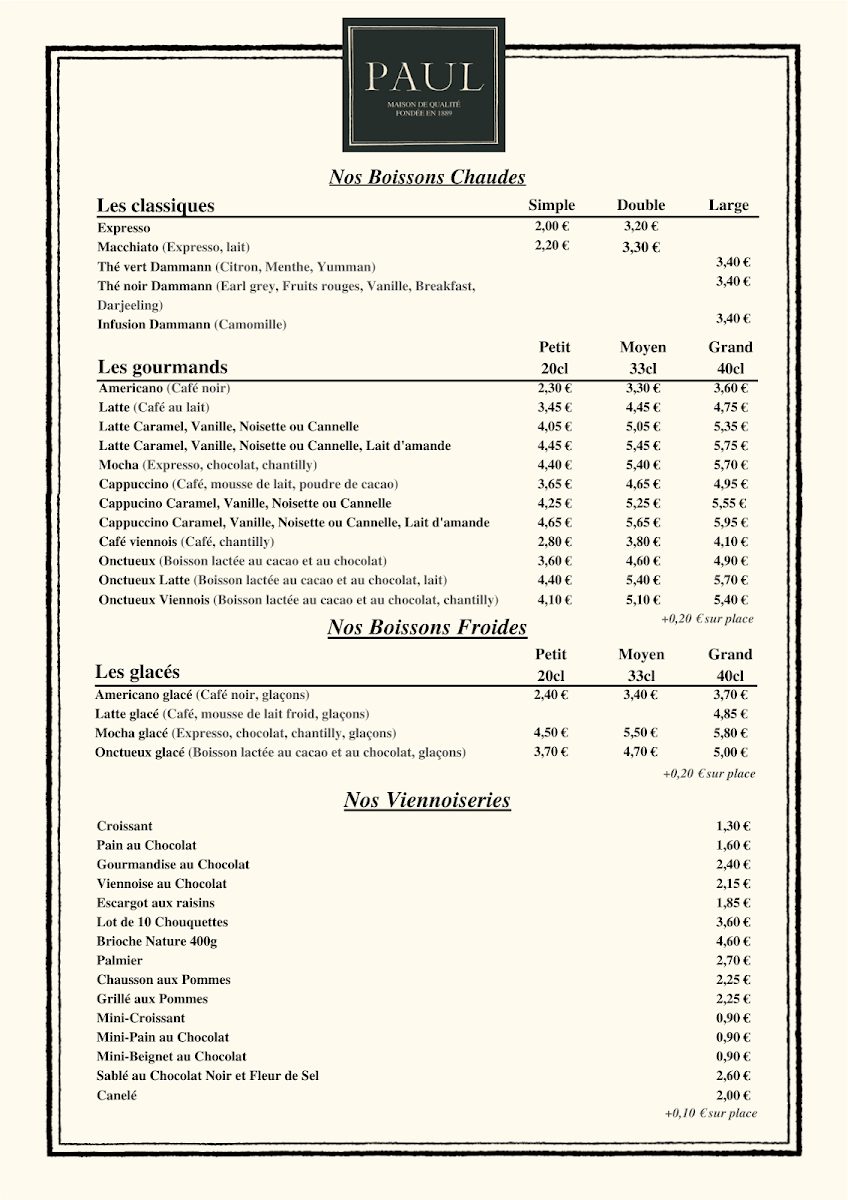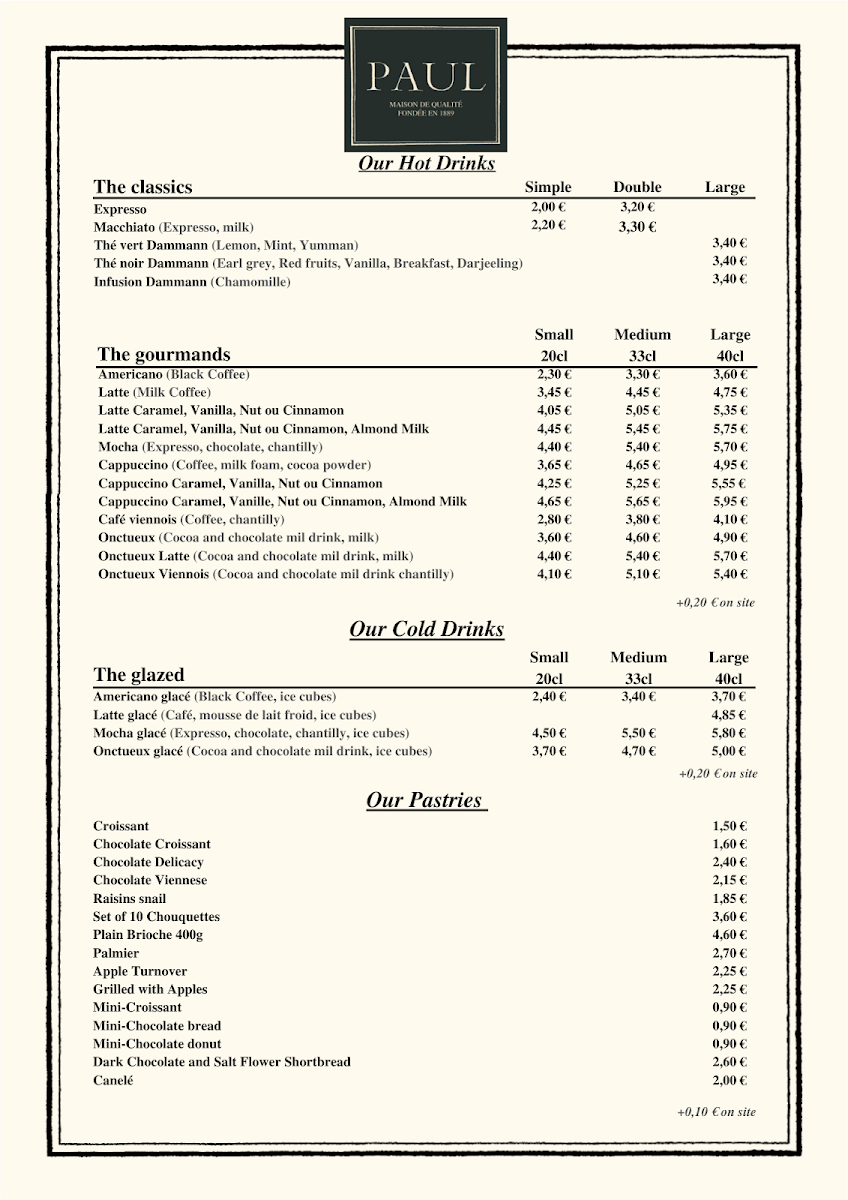 The assortment of beverages at PAUL is equally impressive, with options ranging from classic coffee and tea selections to creative cold brews like Le frappé macaron café and Le moccha glacé. Whether you're in the mood for a relaxing cup of hot chocolate or a refreshing iced latte, PAUL has something for everyone.
