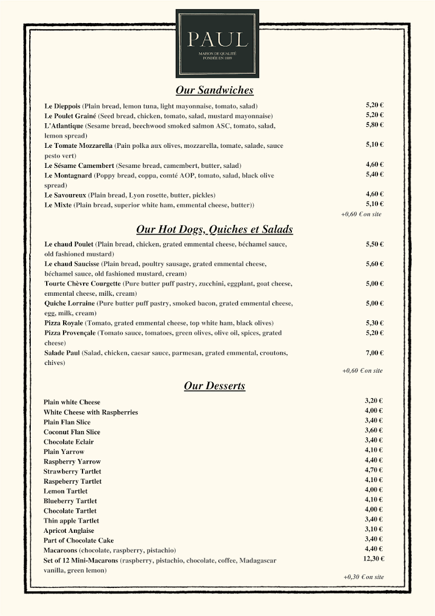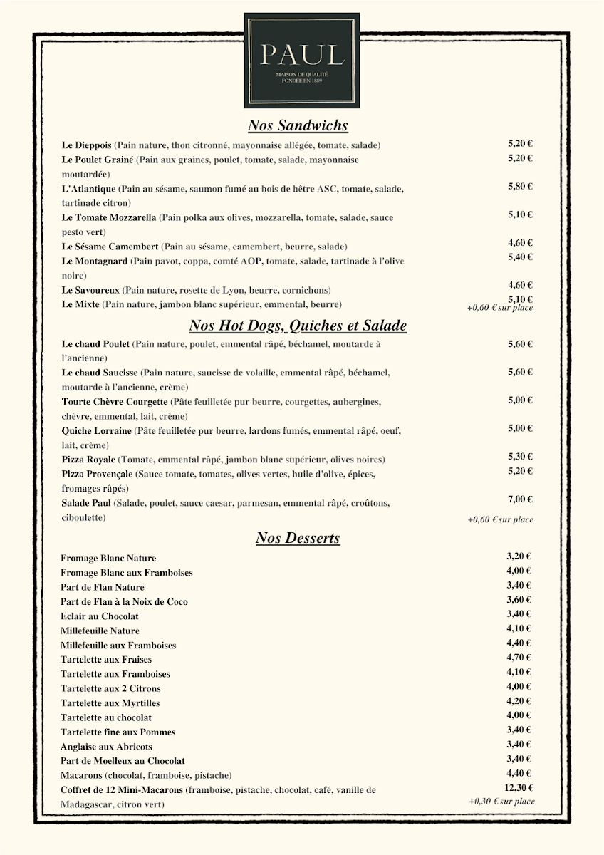 When it comes to desserts and pastries, PAUL excels with offerings like Le macaron vanille, Le millefeuille framboise individuel, and La tartelette aux framboises. Each item is a work of art, showcasing the brand's commitment to excellence in both flavor and presentation.